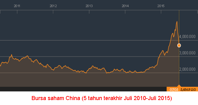 Gambar di bawah ini menunjukkan pergerakan bursa saham China sepanjang Juli 2014 sampai dengan Juli 2015. Hanya dalam 3 minggu, sudah merosot 30% dari puncaknya di bulan Juni.